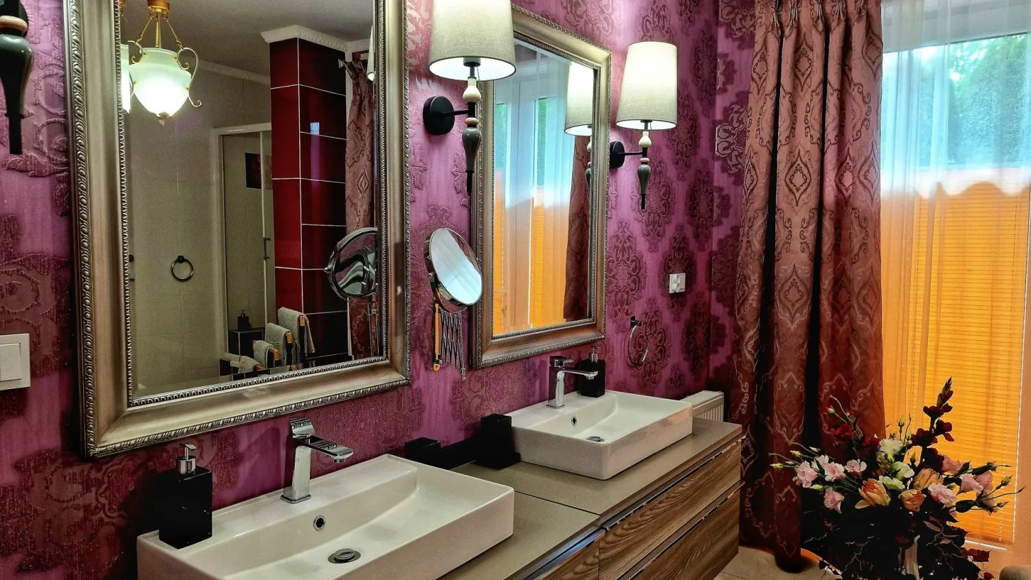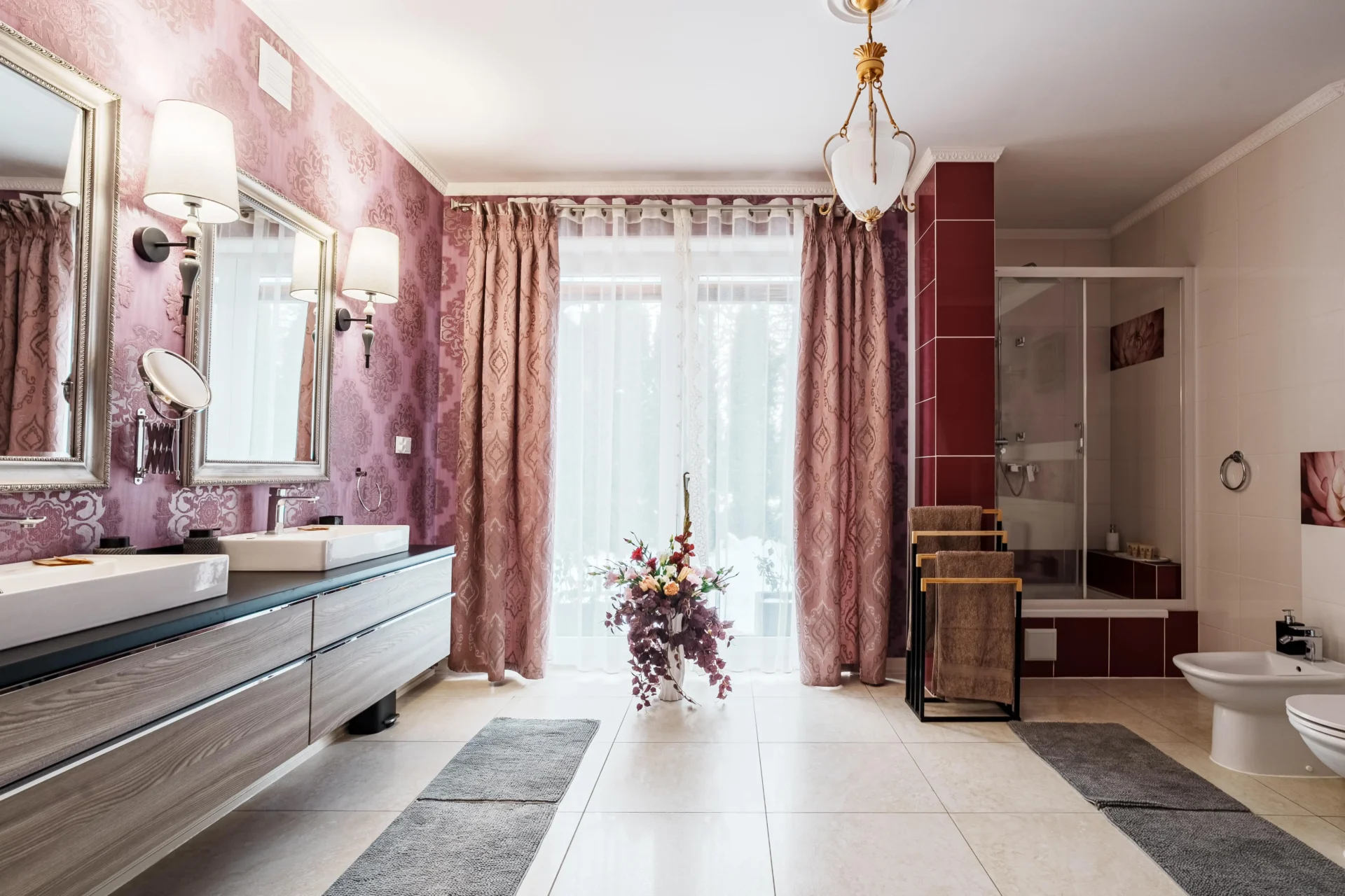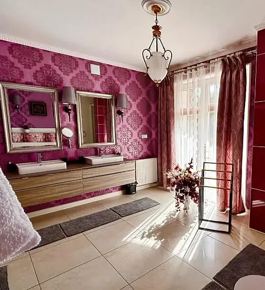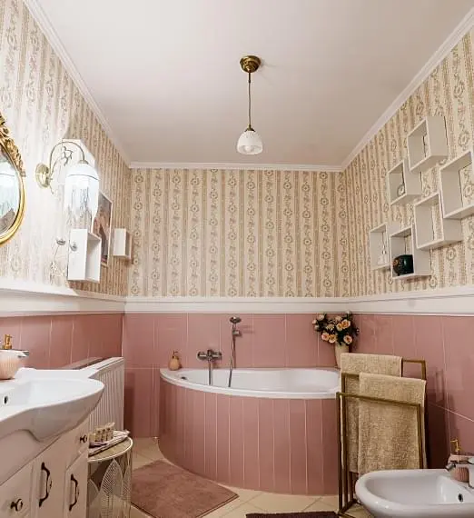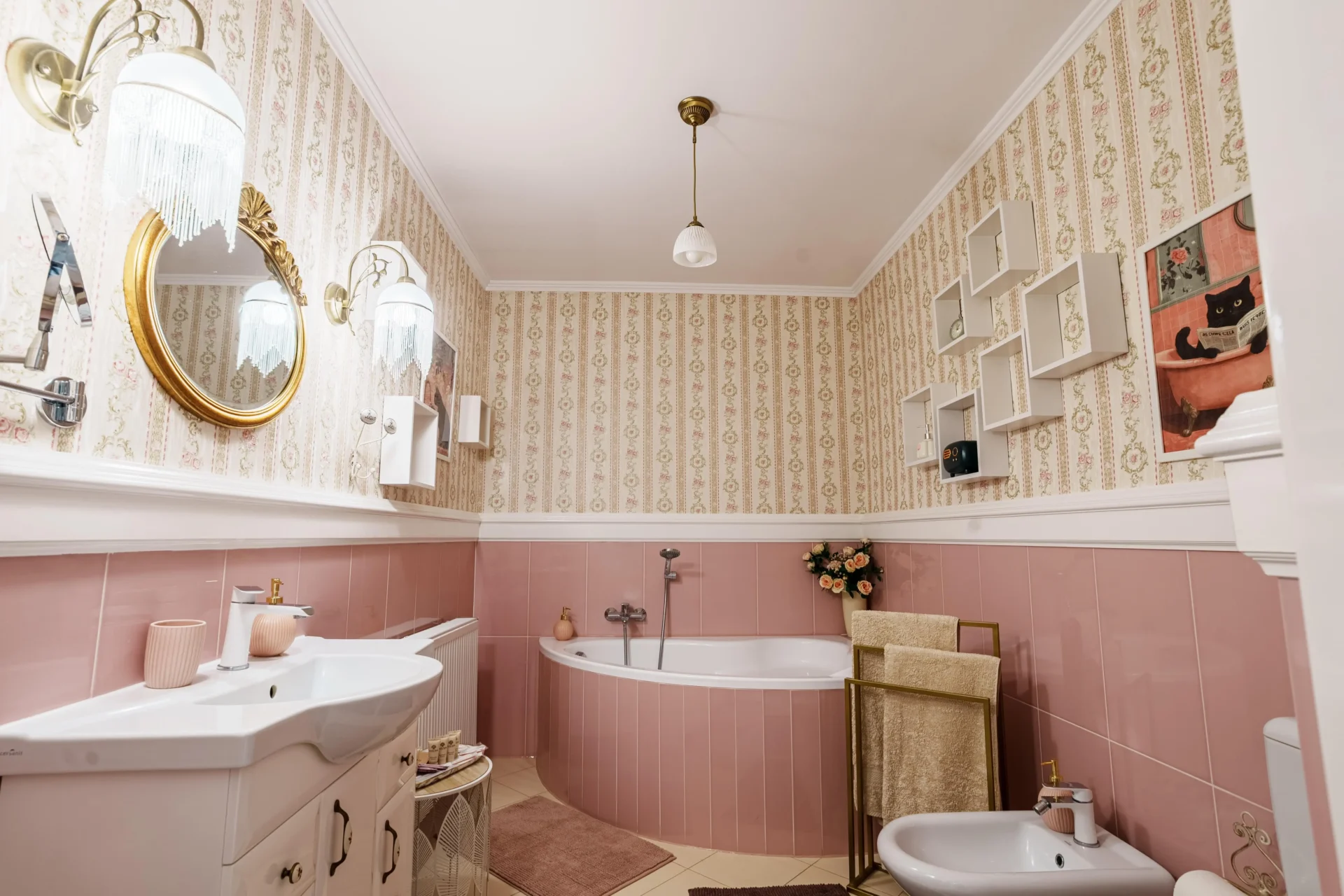 Stylowe wnętrze w klimacie lat 50/60., z różowymi detalami i zabudowaną wanną.