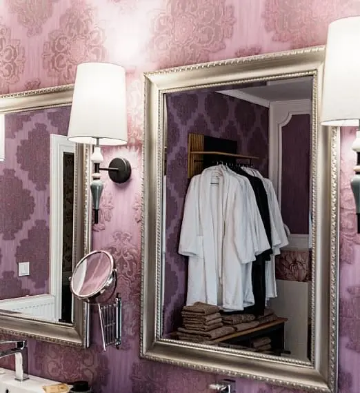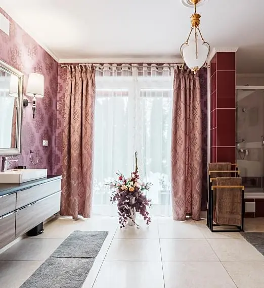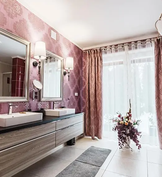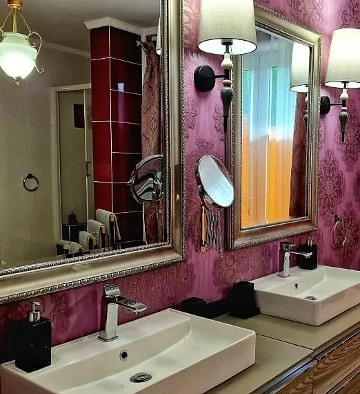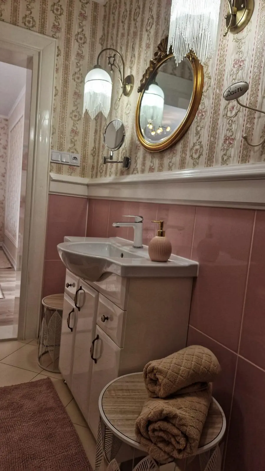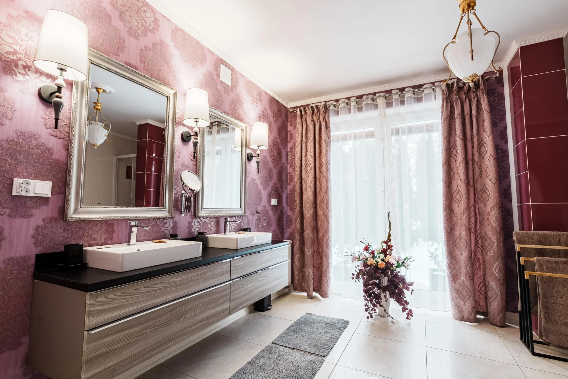 Stylowe wnętrze w klimacie lat 50/60., z różowymi detalami i zabudowaną wanną.