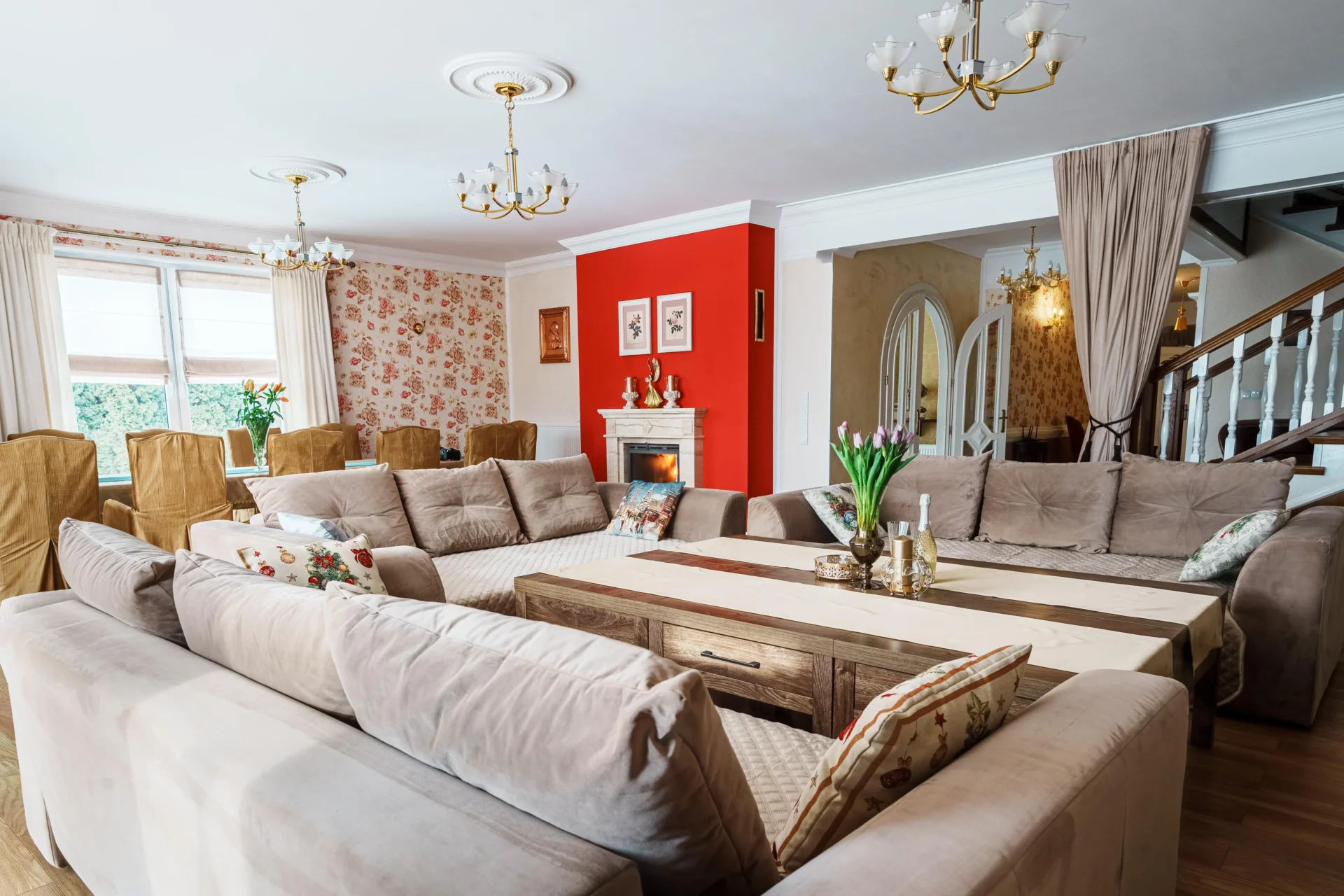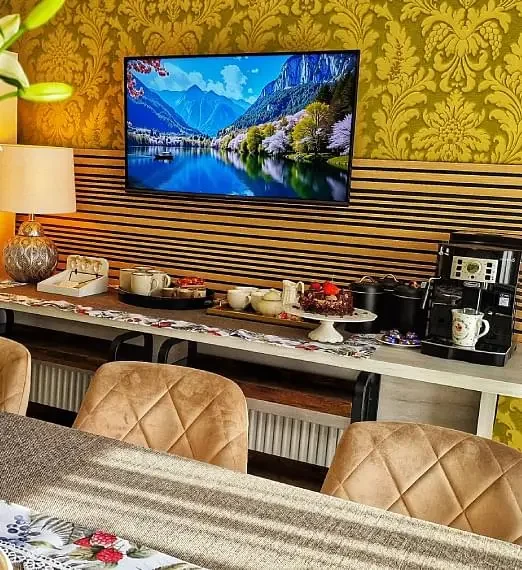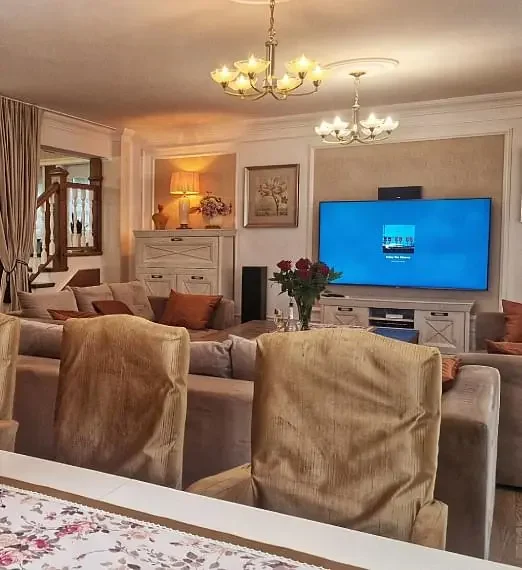 Przestronny, 90-metrowy salon to elegancka i komfortowa przestrzeń do życia, relaksu i spotkań – od wieczorów przy kominku po rodzinne posiłki czy kameralne prezentacje.