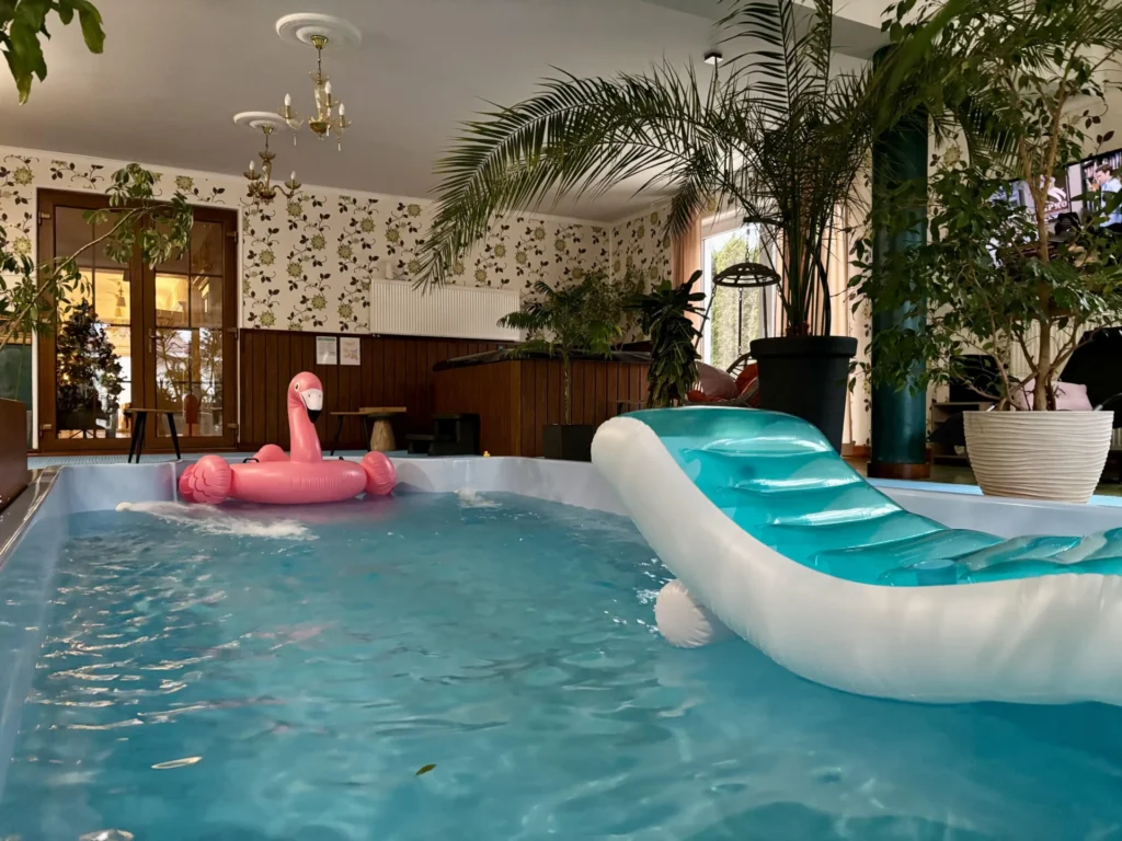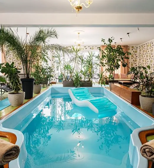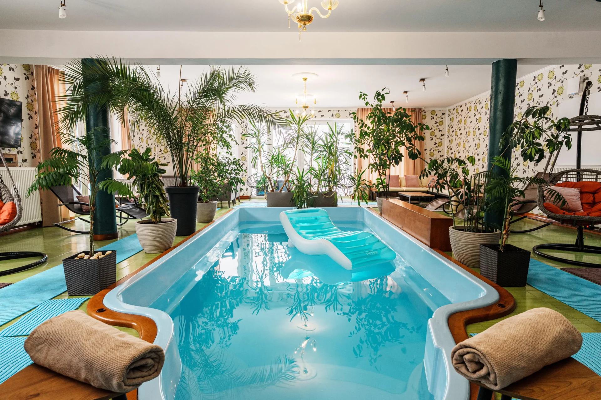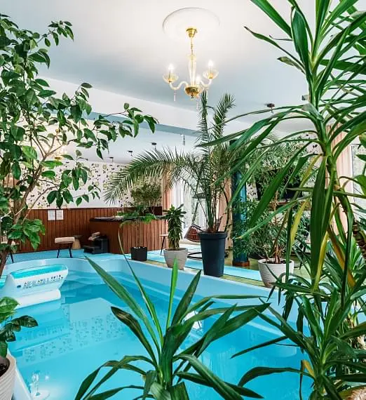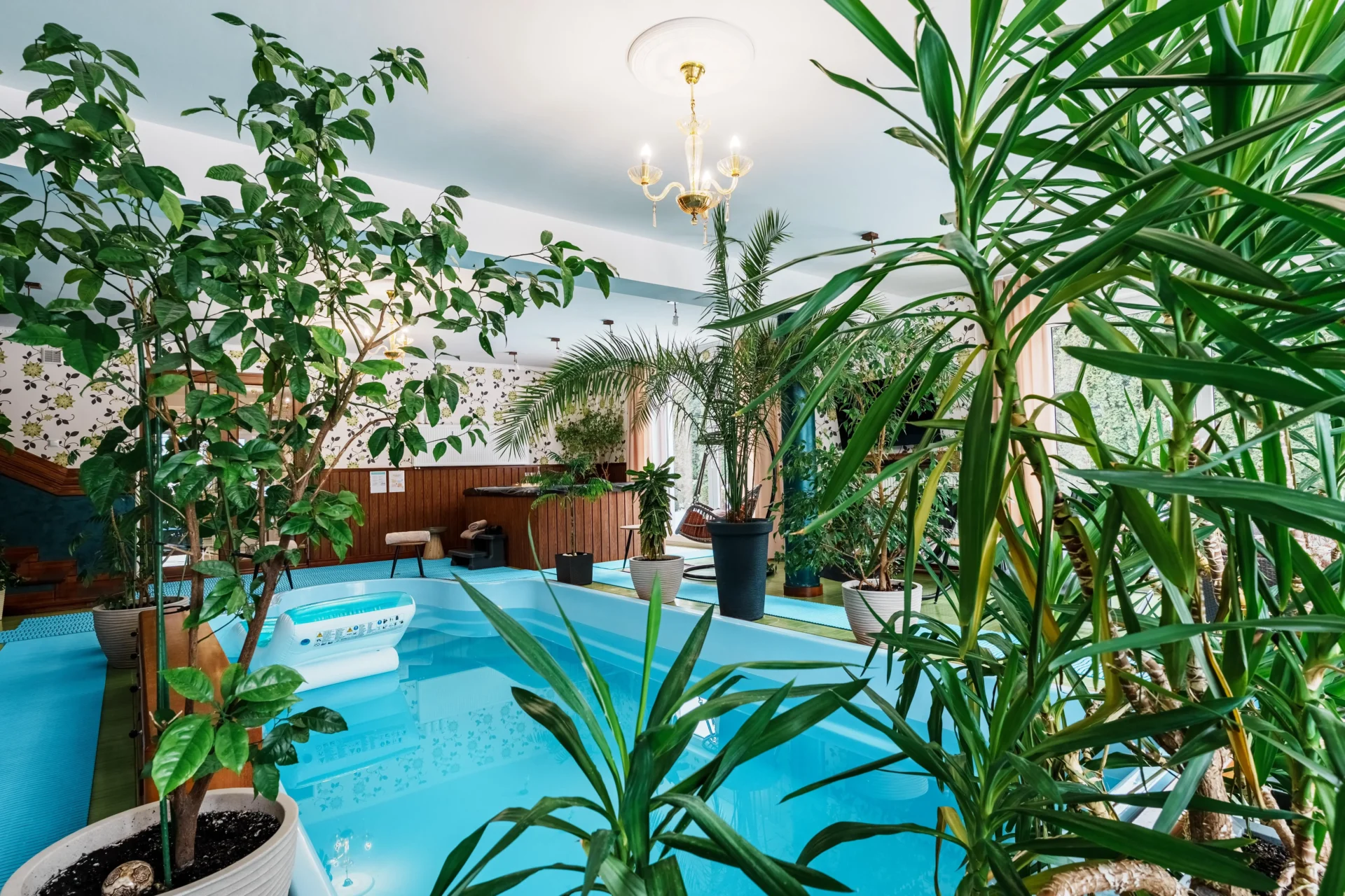 Kryty basen z podgrzewaną wodą, dostępny przez cały rok, otoczony bujną, egzotyczną roślinnością.