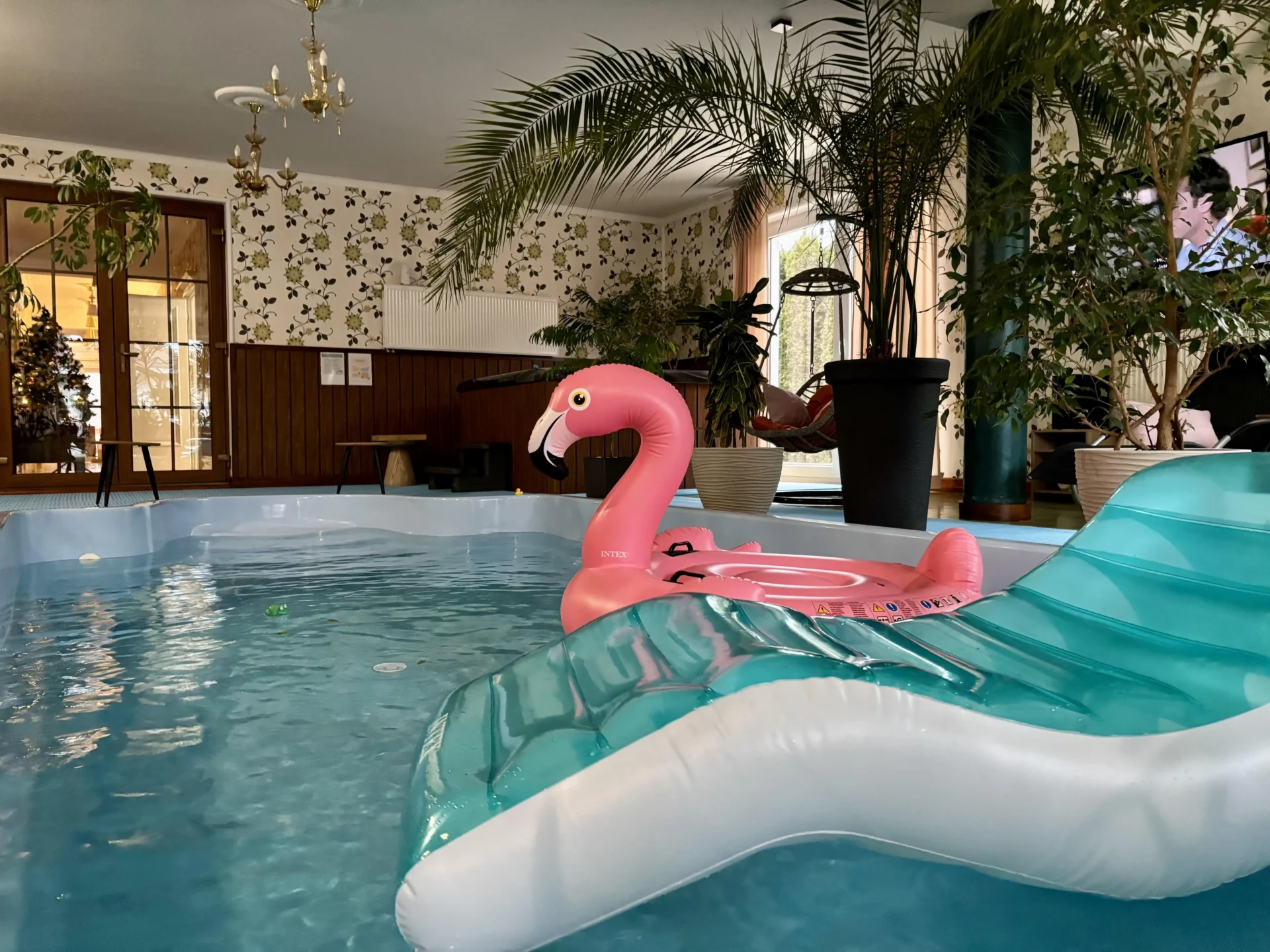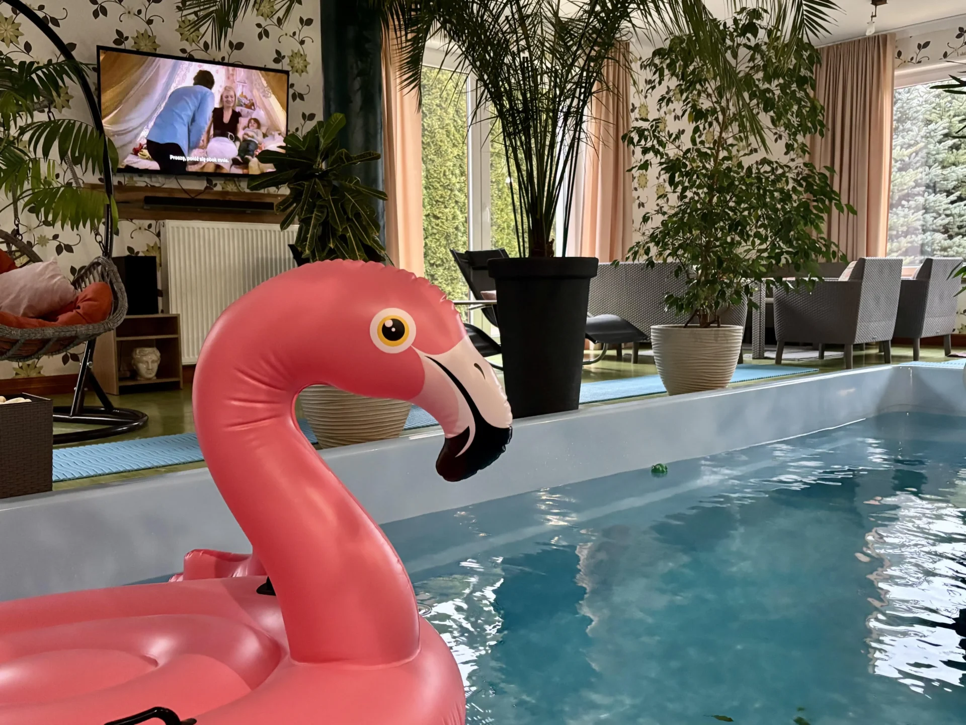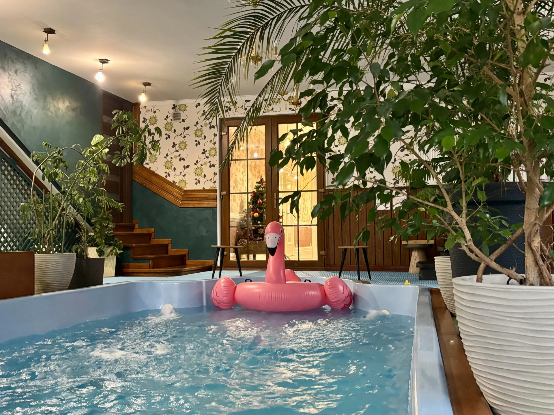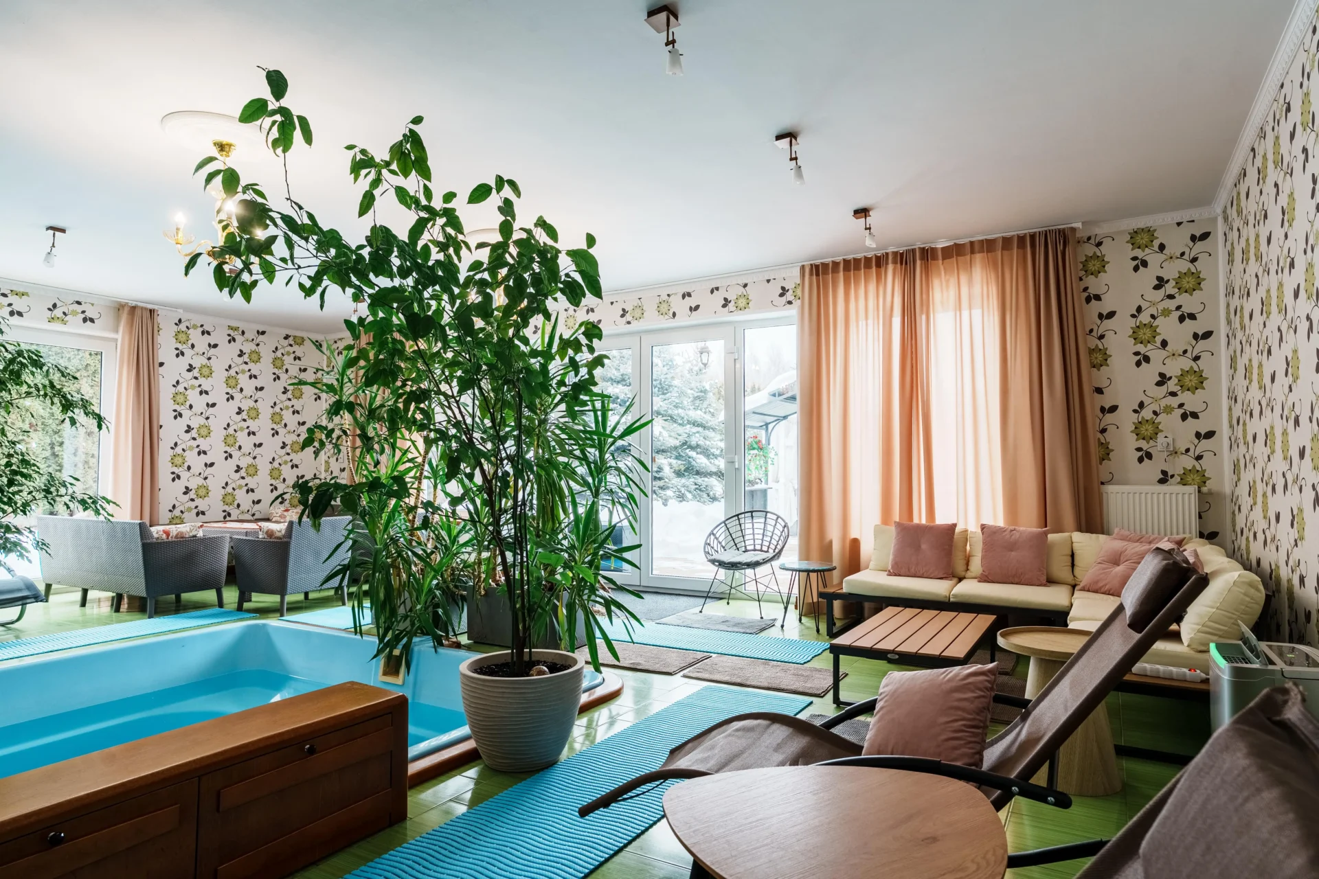 Kryty basen z podgrzewaną wodą, dostępny przez cały rok, otoczony bujną, egzotyczną roślinnością.