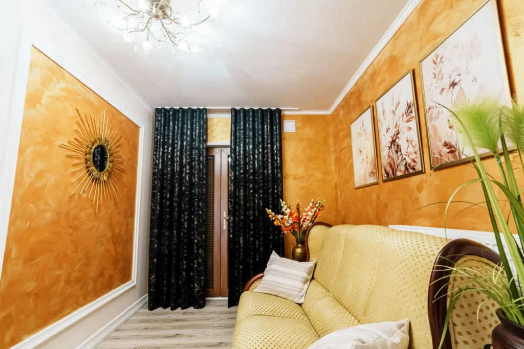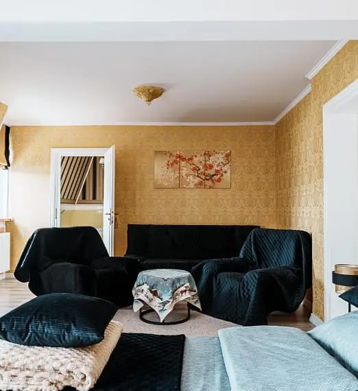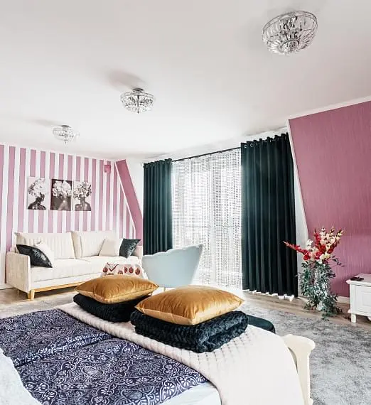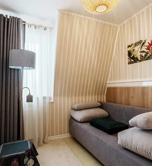 Pokój można oddzielić grubą kotarą, tworząc prywatną przestrzeń (również jako miejsce do spania) lub salę kinową.