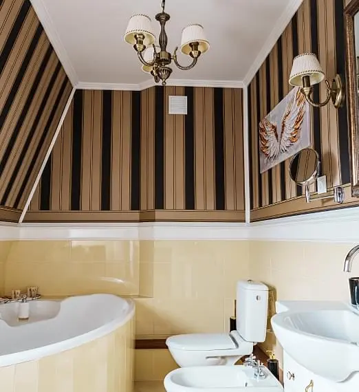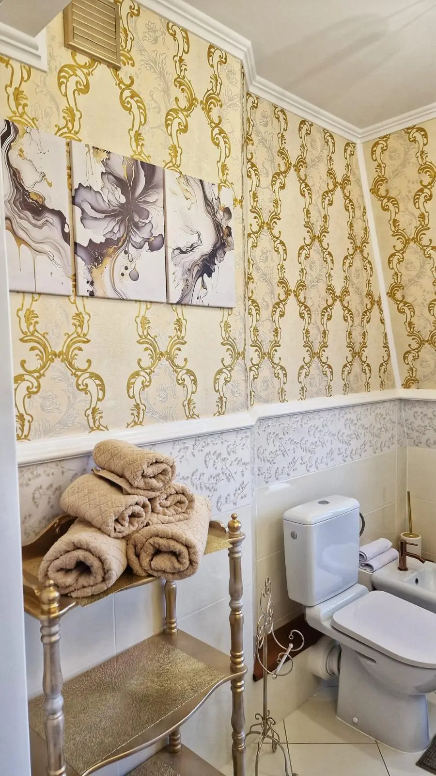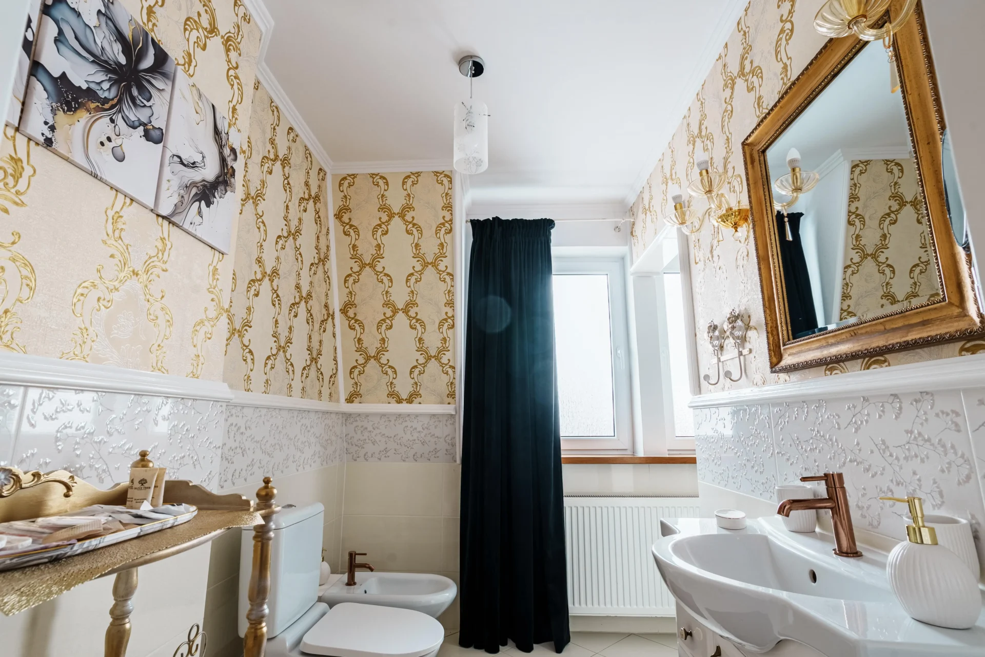 Elegancka łazienka w stylu glamour z nastrojowym oświetleniem i złotymi akcentami – idealna na chwile relaksu.