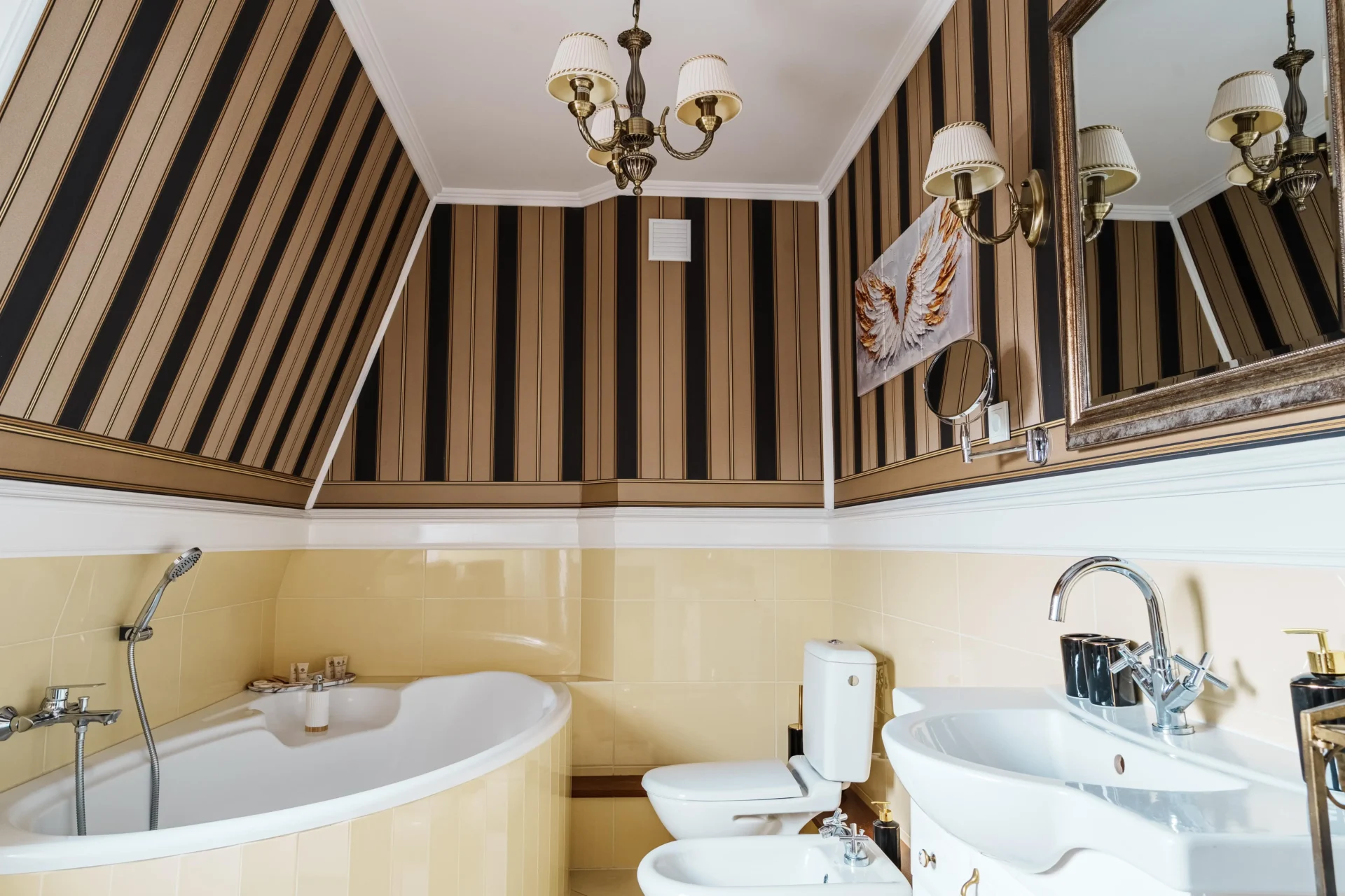 Elegancka przestrzeń z wolnostojącą wanną, w stylu czarno-złotym i nastrojowym oświetleniem.