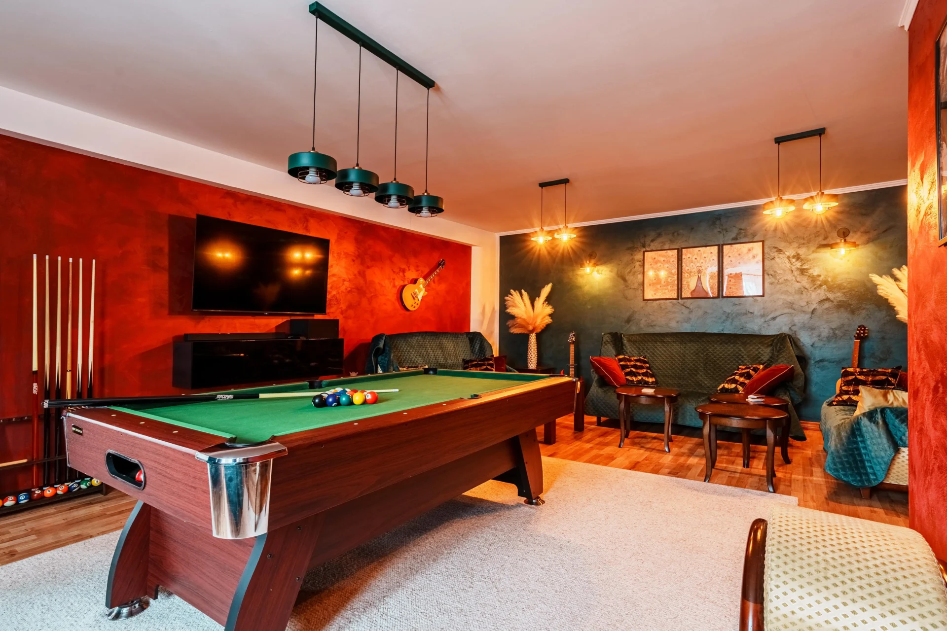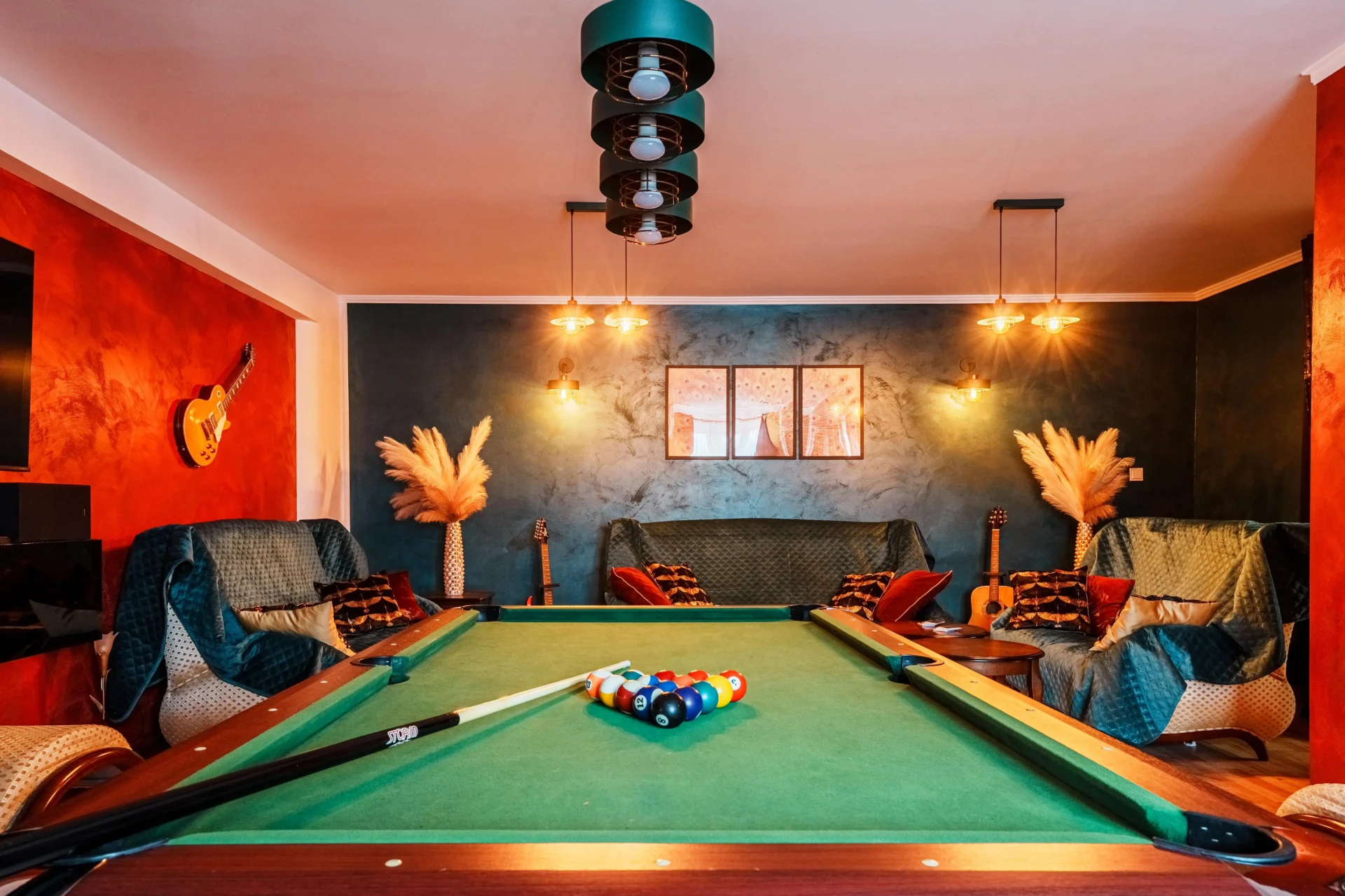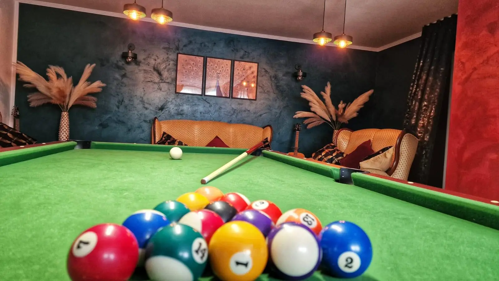 Przytulna przestrzeń z profesjonalnym stołem bilardowym, gdzie możesz spędzić czas w towarzystwie przyjaciół.