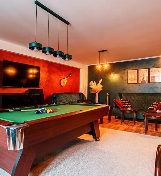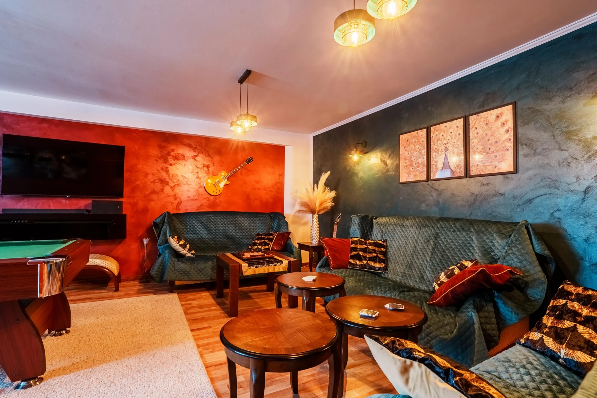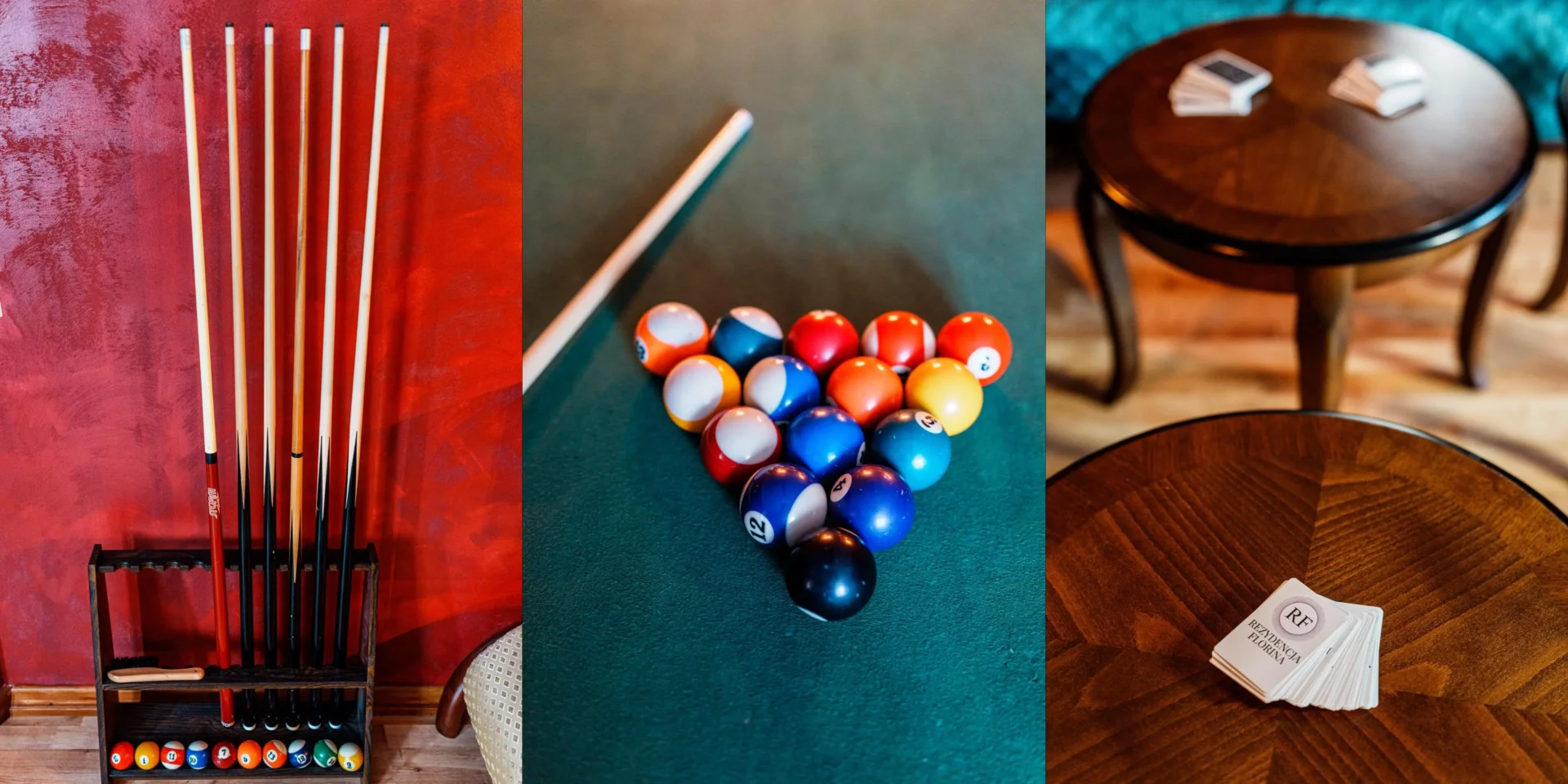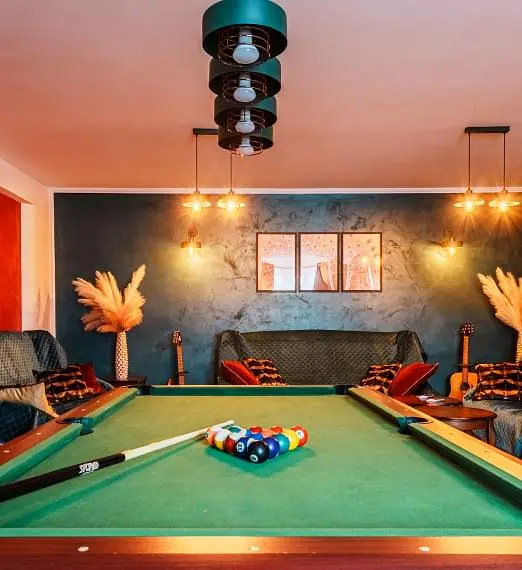 Przytulna przestrzeń z profesjonalnym stołem bilardowym, gdzie możesz spędzić czas w towarzystwie przyjaciół.