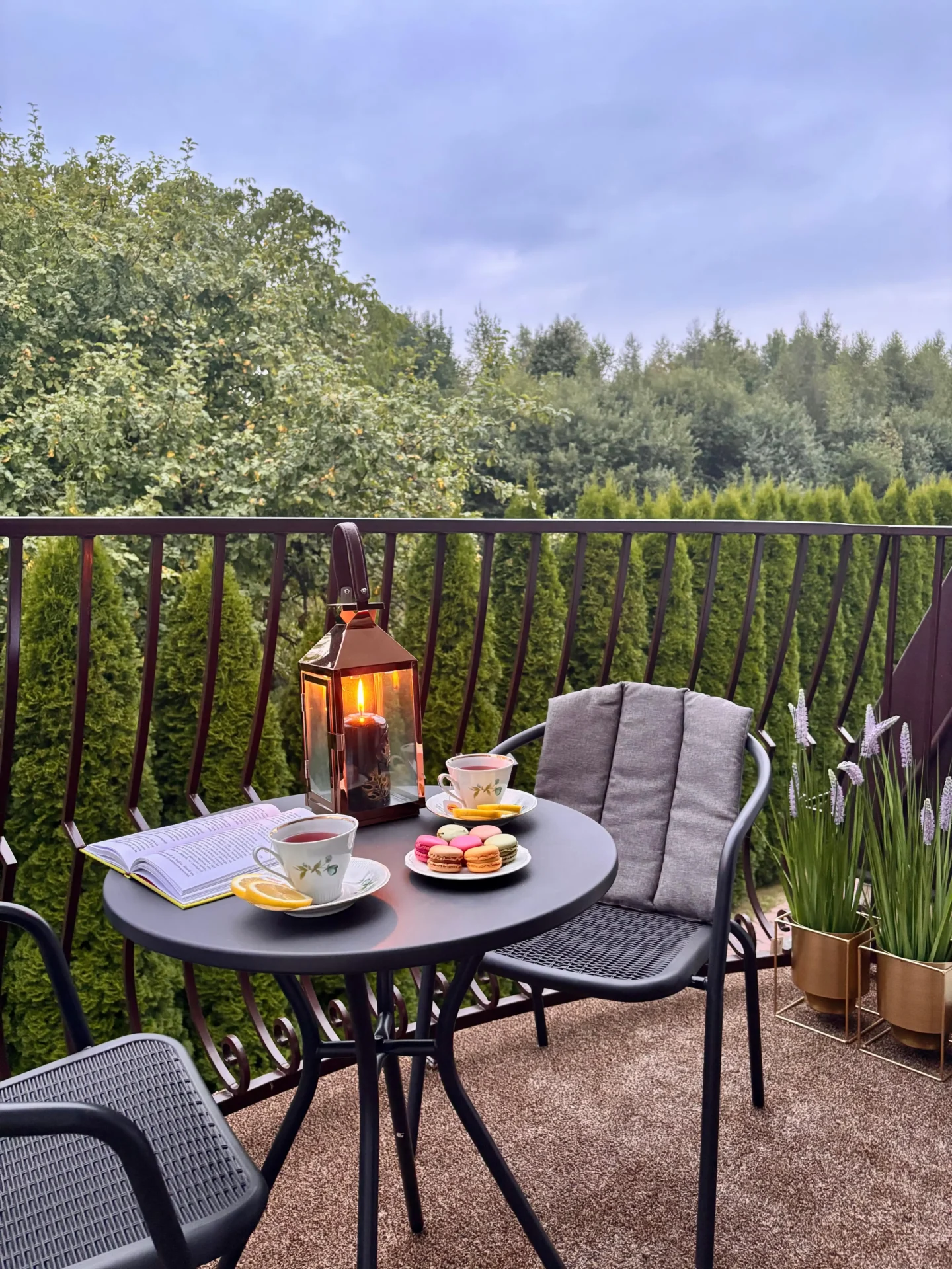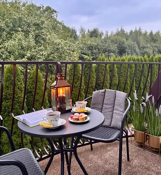 Balkon z miejscem do siedzenia i widokiem na ogród