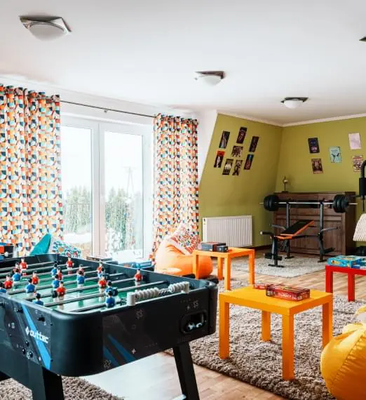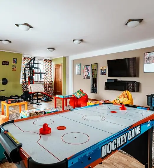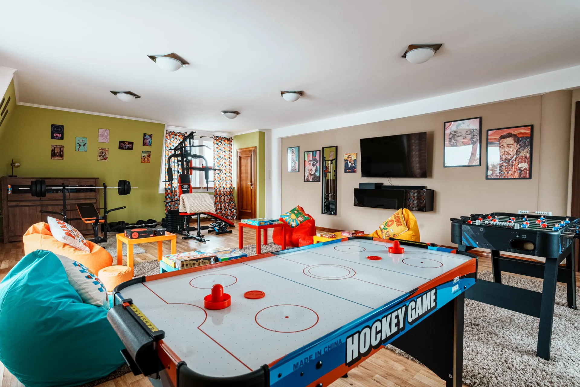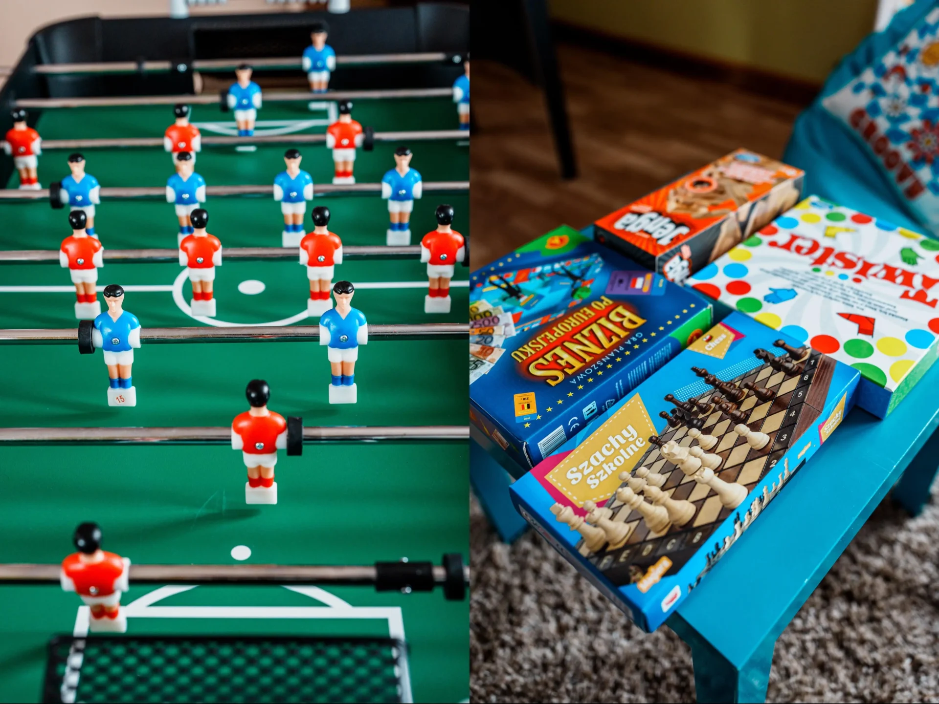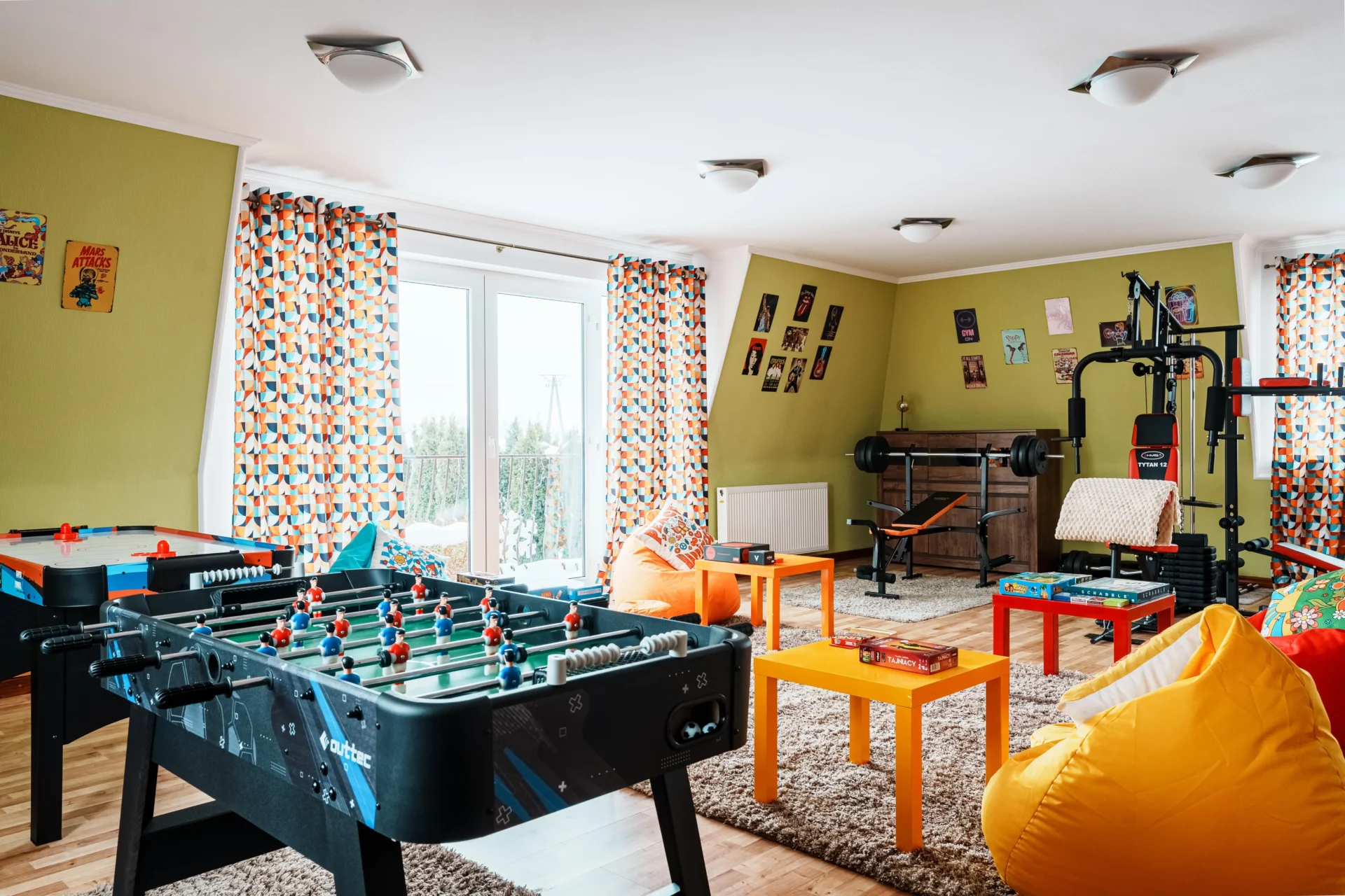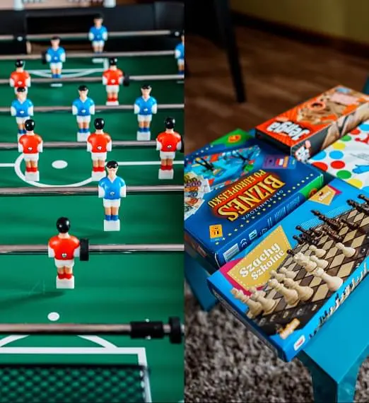 Strefa gier – piłkarzyki, stół do air hockeya oraz gry planszowe zapewniają rozrywkę dzieciom i dorosłym