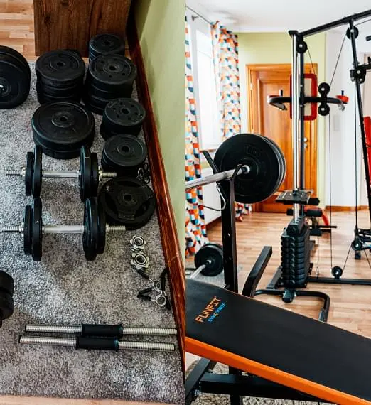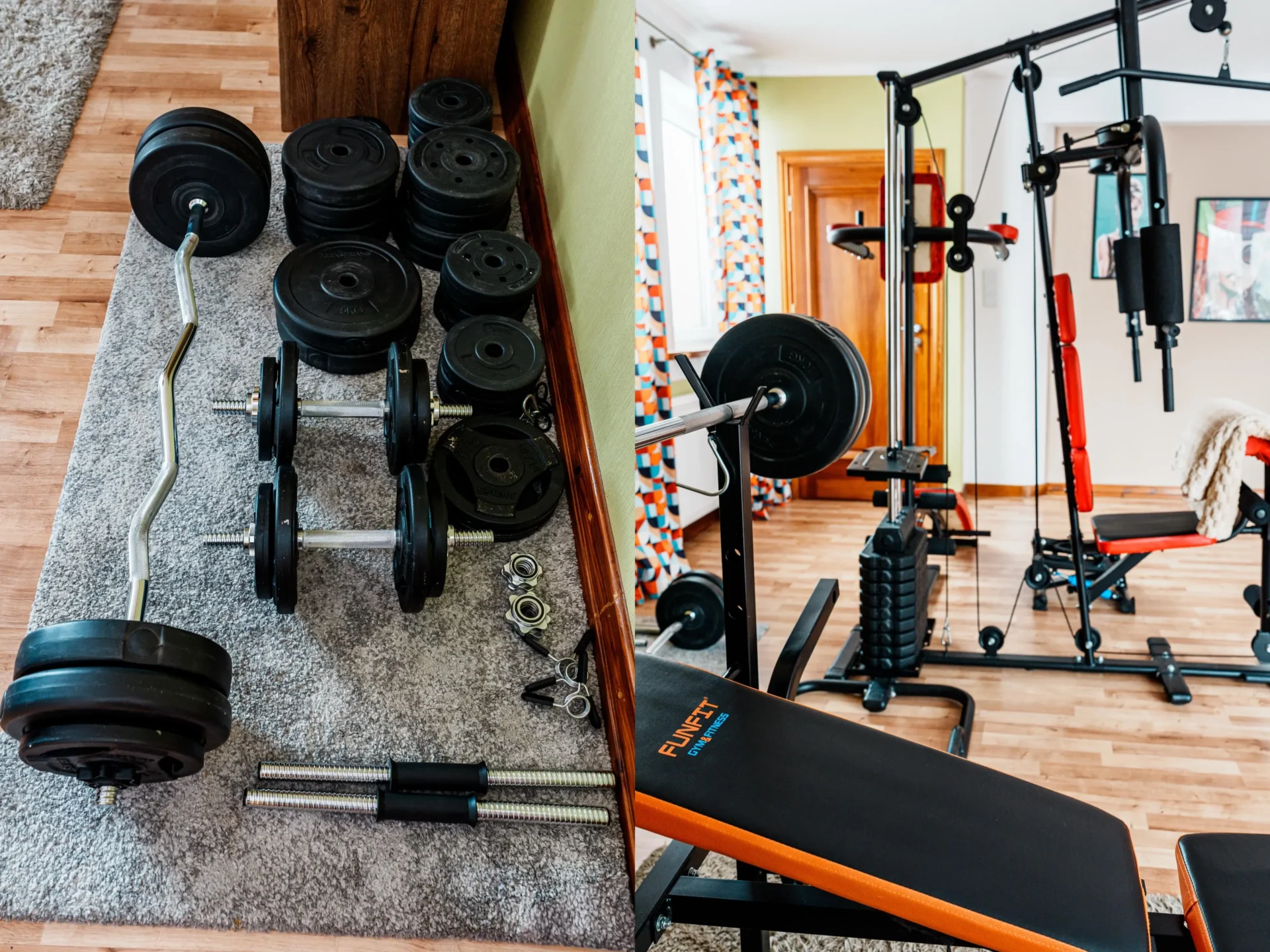 Strefa treningowa – przestrzeń wyposażona w orbitrek, wolne ciężary oraz ławkę treningową, które pozwalają na różnorodne ćwiczenia i skuteczne dbanie o formę.
